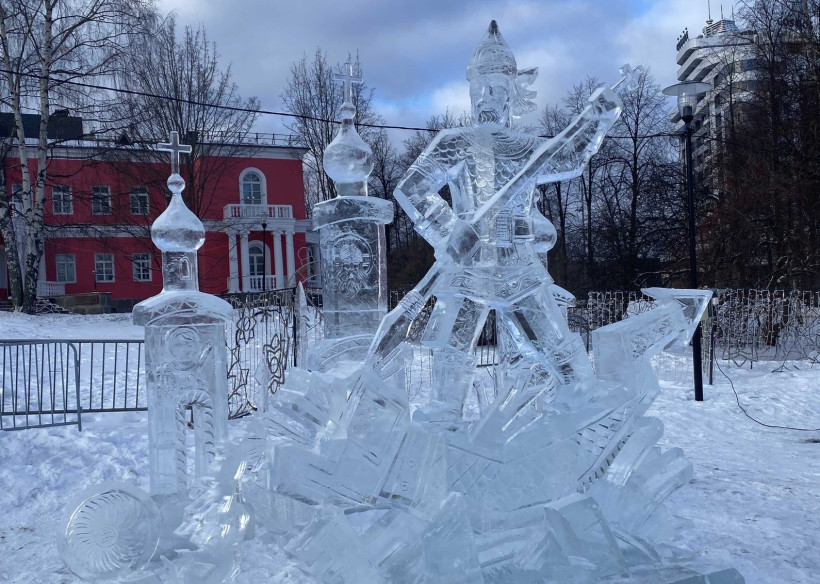 Четырехметрового Александра Невского изо льда установили в сквере в Благовещенске