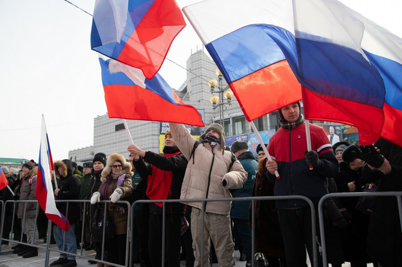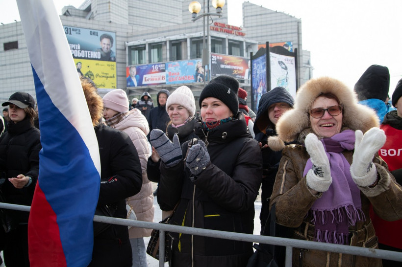 Посмотреть на тех, кто обливается холодной водой, пришло немало горожан — как взрослых, так и молодежи. С собой благовещенцы взяли флаги России.