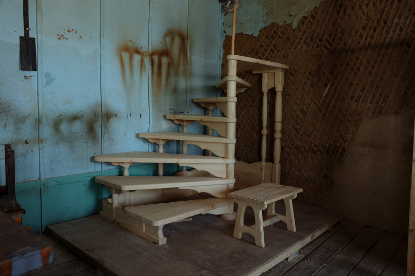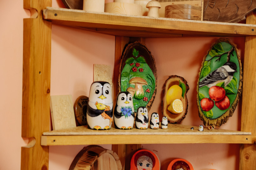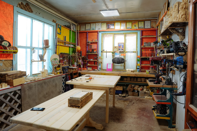 Илья ведет Василия Орлова в святая святые — столярную мастерскую. Крепкое здание, рядом с которым находится пилорама, построили из лиственницы также родные Ильи Кучерова более 30 лет назад. Шкафы, столы, лавочки, двери, игрушки — помещение заполнено творениями Кучеровых и теплым запахом свежего дерева. Изготавливают изделия из сосны и лиственницы, причем в сырье идут даже обычные ветки.