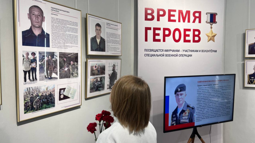 В экспозиции представлены фотографии и личные вещи 30 погибших в зоне СВО амурчанВ память о героизме и доблести амурских бойцов в Амурском областном краеведческом музее открылась выставка «Время Героев». Она посвященная землякам-участникам спецоперации на Украине. В экспозиции представлены фотоснимки, документы, личные вещи, военная форма, биография 30 погибших в зоне СВО уроженцев Приамурья.