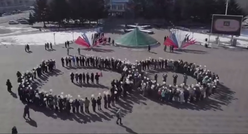 Амурчане с белыми воздушными шарами в руках выстроились на площади и сформировали знак бесконечности. Колорита празднованию девятой годовщины со Дня воссоединения страны с полуостровным регионом добавили российские флаги.