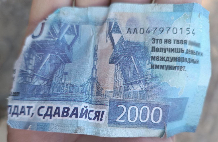 На позициях России в зоне специальной военной операции на Украине ВСУ сбрасывают листовки в виде купюр с призывом сдаться. Фотографии псевдобанкноты номиналом две тысячи рублей с изображением космодрома Восточный и острова Русский опубликовал в Telegram Дмитрий Рогозин. Бывший глава Роскосмоса теперь руководит научно-техническим центром «Царские волки» и находится на Донбассе.