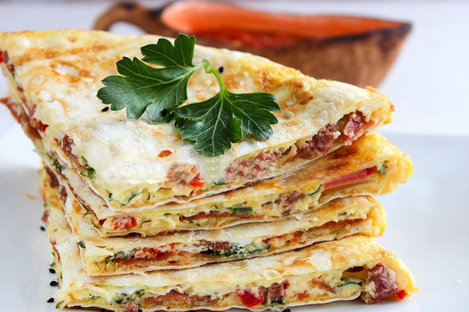 Яйца посолите, поперчите, взбейте вилкой. Вылейте смесь сверху на лепешку, выложите колбасу, перец, зелень, сверху — оставшийся сыр. Накройте второй лепешкой, руками немного прижмите. Накройте крышкой и готовьте минут 5–6 на умеренном огне, чтобы яйцо успело приготовиться. Затем переверните на другую сторону лопаткой и готовьте еще 5 минут под крышкой.