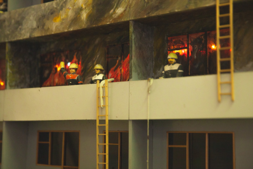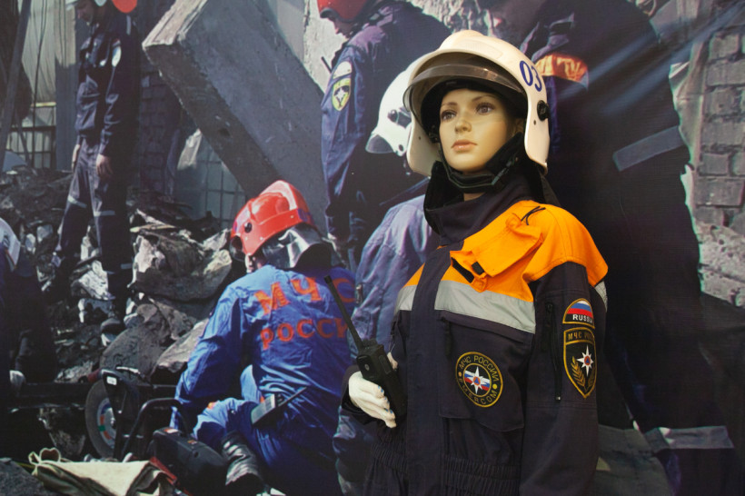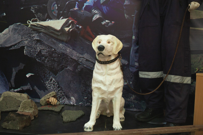Они избавились от одного из стендов, на котором были размещены электрические реле, а на его месте установили огромный баннер с изображением работы спасателей. Рядом сделали подиум, на нем разместили женский манекен кинолога и лабрадора — собаки именно этой породы чаще других используются для поиска людей под завалами. Фигуру четвероногого помощника спасателей хотели сделать из папье-маше, но, как признавались сотрудники музея, не дал им Бог таланта ваятеля. Фигуру собаки в натуральную величину просто купили в магазине. За свои деньги.
