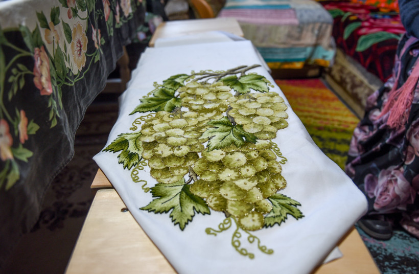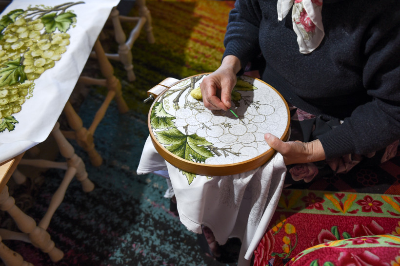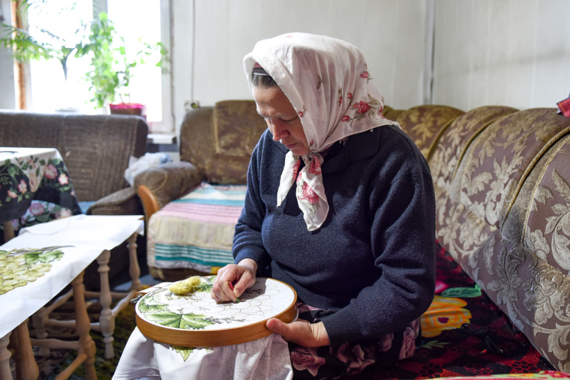 Главное увлечение в общине — вышивка. Как говорят женщины, с удовольствием сидят с иглой даже мальчишки. Ольга Реутова достает белые полотна с изумрудным переливом вышитых гроздьев винограда.
