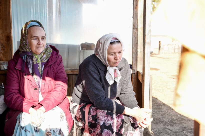 Утро женщин начинается в пять утра с молитвы. Пока управятся с коровами и курами, пора готовить обед. Староверы сами делают сыр, творог, сметану. Шьют одежду тоже своими руками — женщины носят только длинные юбки и никогда не ходят с непокрытой головой — волосы нельзя распускать даже на ночь. Косметика тоже не в ходу, хотя молодёжь, признаются многодетные мамы, нет-нет да и интересуется украшательством.