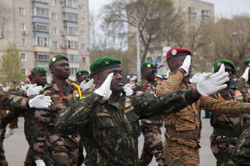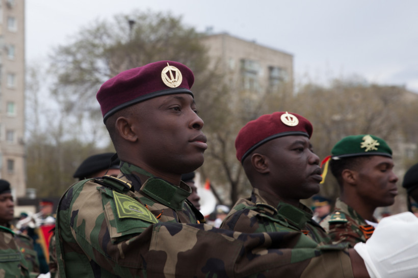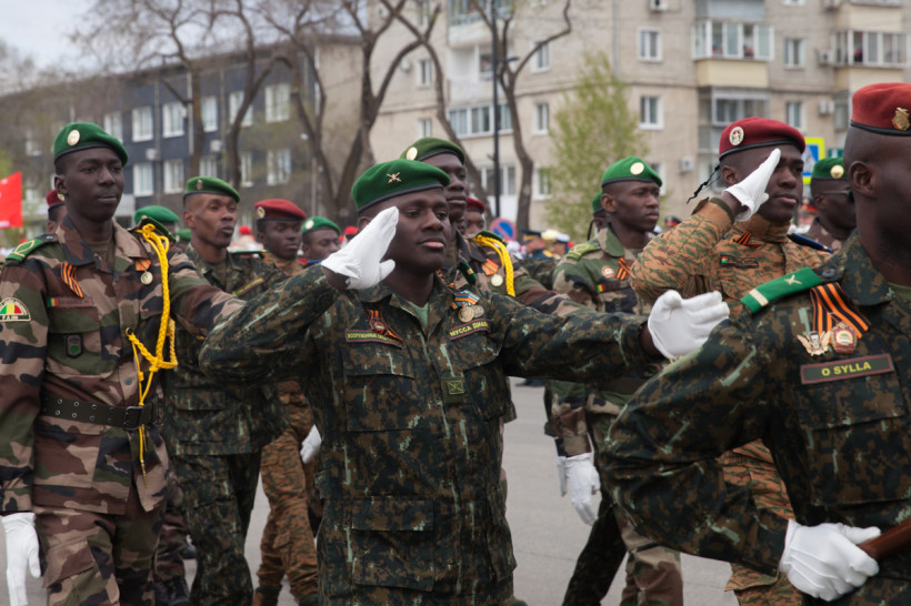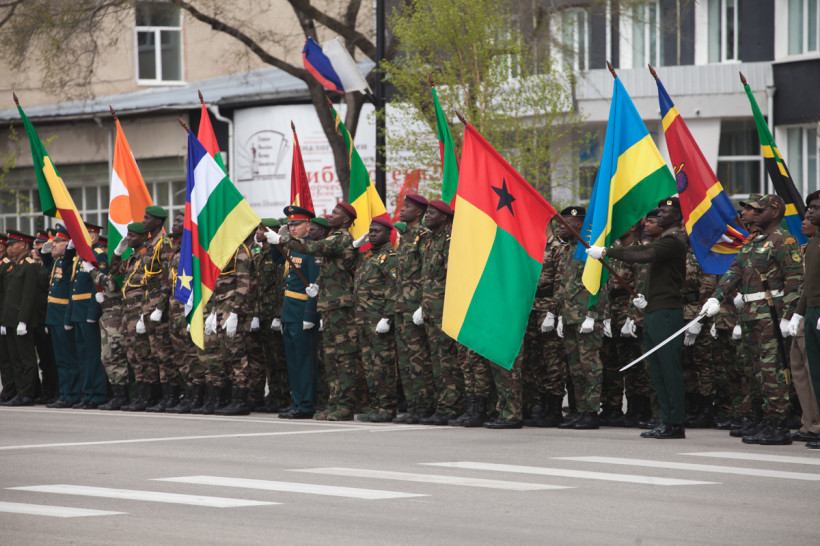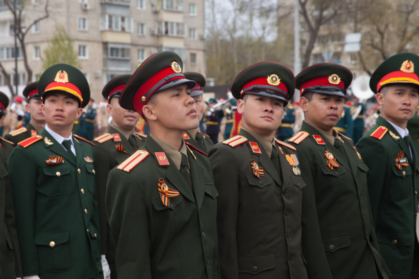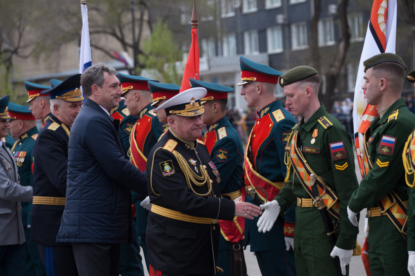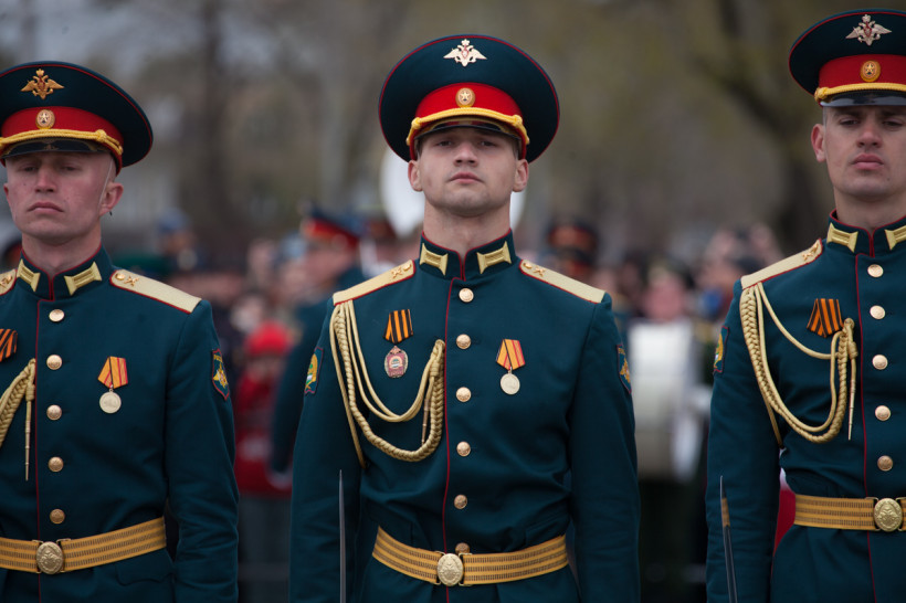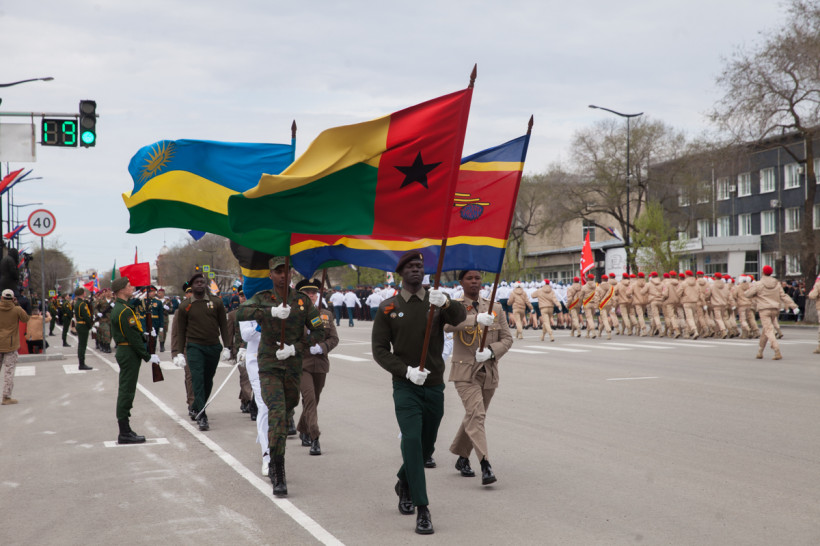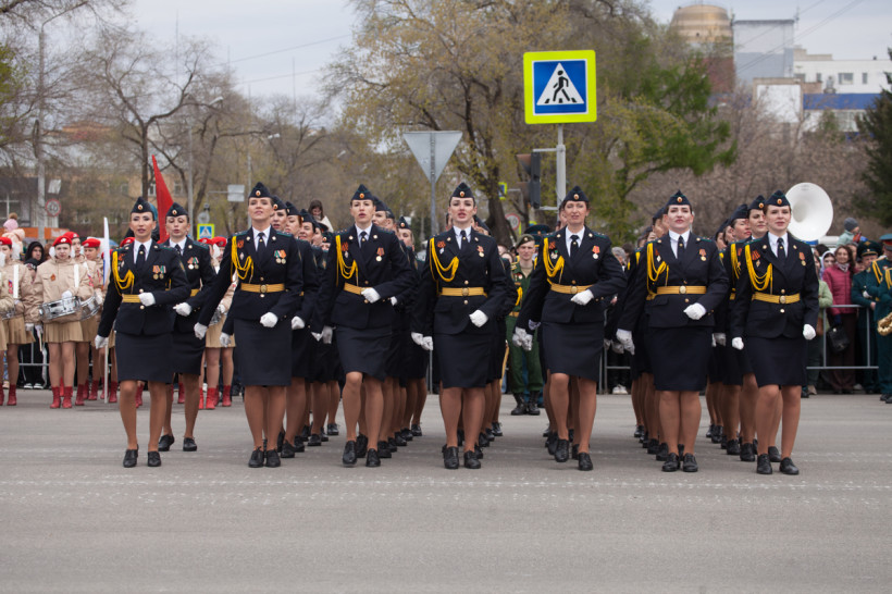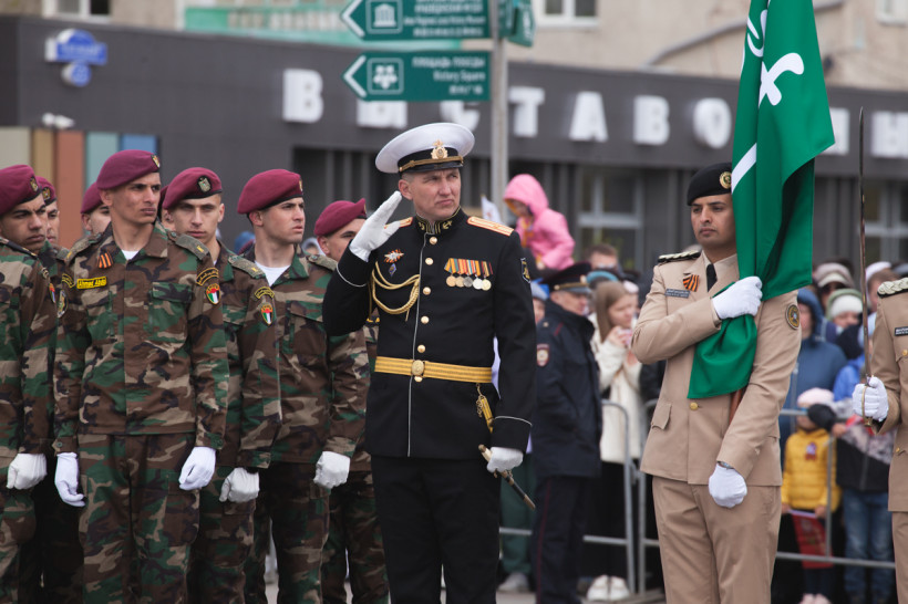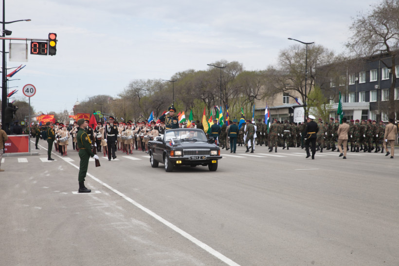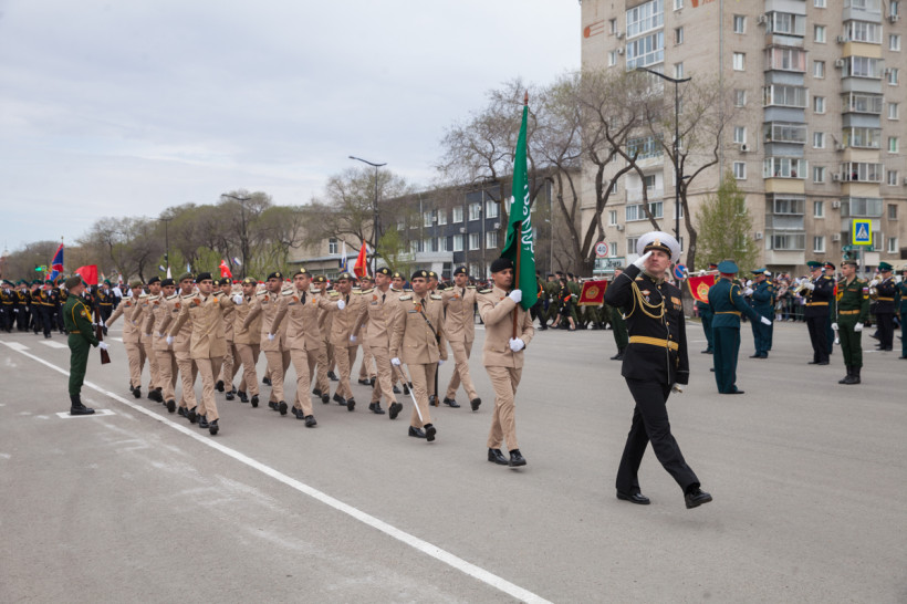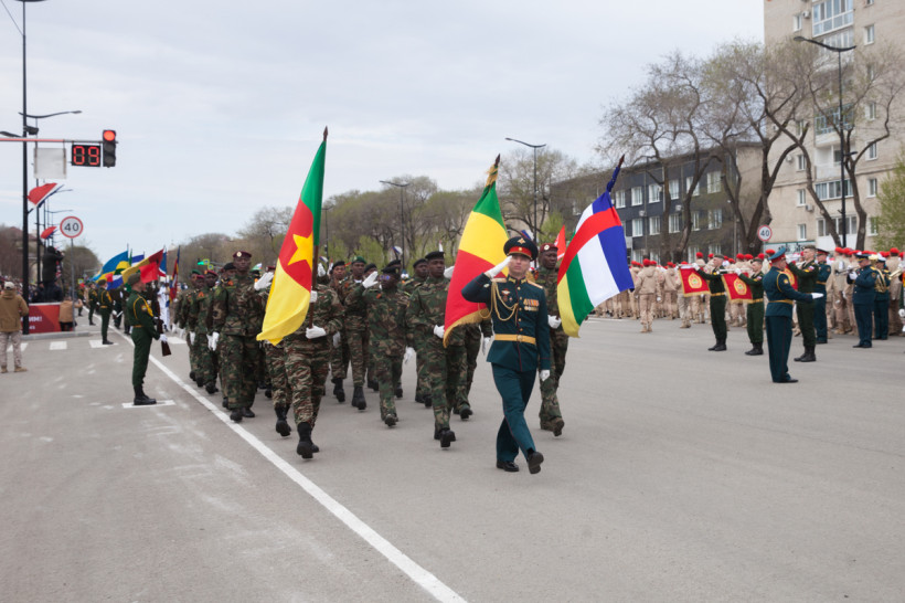 Чеканя шаг, прошли 43 парадных расчета: юные барабанщики Амурского кадетского корпуса, офицеры-преподаватели, курсанты Российской армии и национальные группы иностранных государств, проходящие обучение в ДВОКУ.
