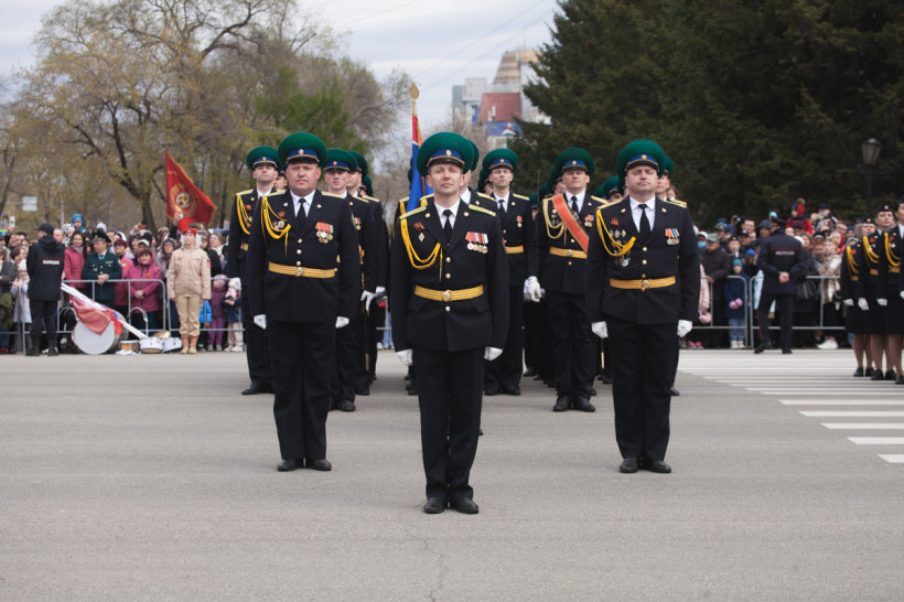Строем прошли учащиеся пограничных классов, воспитанники и руководители военно-патриотических клубов, ветераны боевых действий, амурские казаки, Союз ветеранов Афганистана.