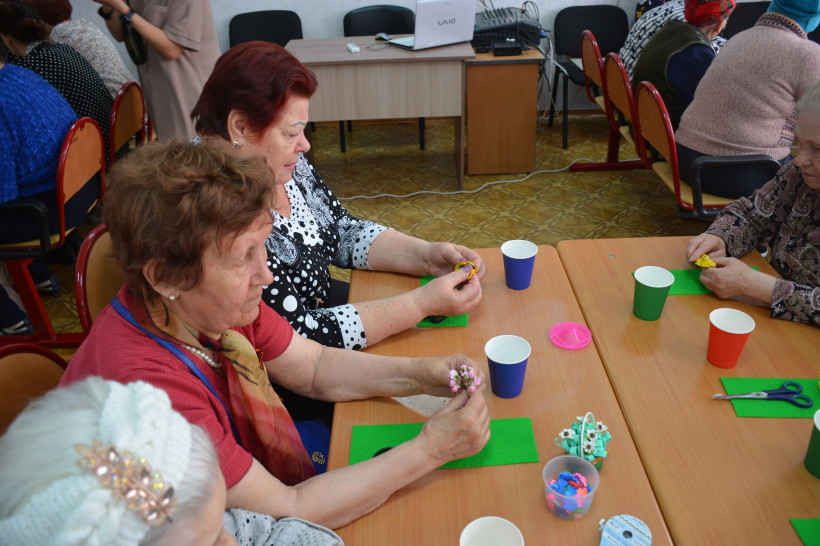 После концерта ветеранов напоили чаем со сладкими пирогами, а затем подготовили и провели мастер-класс по изготовлению корзиночки с цветами.