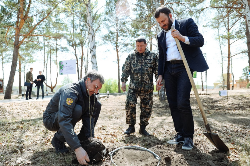 Серебристый тополь высадили в парке «Патриот» Василий Орлов и помощник президента Максим Орешкин