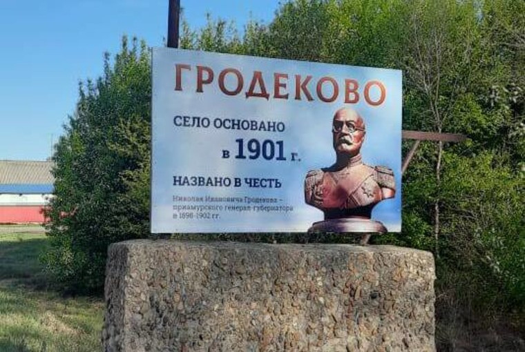 Макет баннера сделал учитель гродековской школы Сергей Бердник. Теперь все, кто въезжает в село, знают: основано оно в 1901 году, а названо в честь генерал-губернатора.
