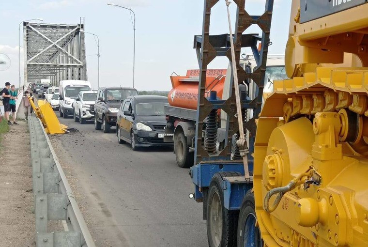 Возле моста через Зею на въезде в Благовещенск с автотрала со спецтехникой упала передняя часть бульдозера. Из-за этого образовалась пробка в обе стороны.