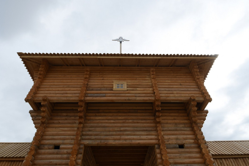 Еще одно крупное сооружение — большая проездная башня. Она украшена большим двухметровым гербом Российской Федерации, изготовленным так же из дерева, но обшитым сталью.
