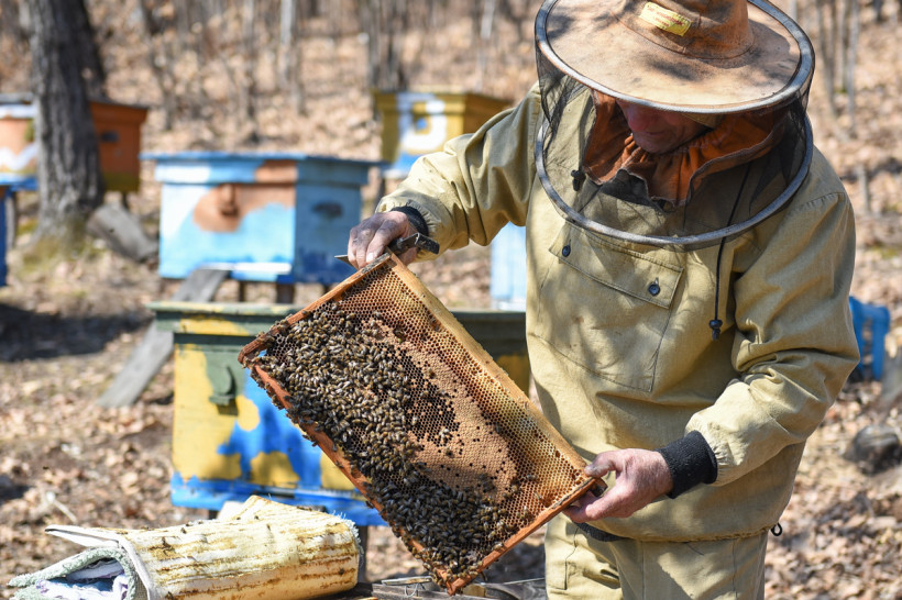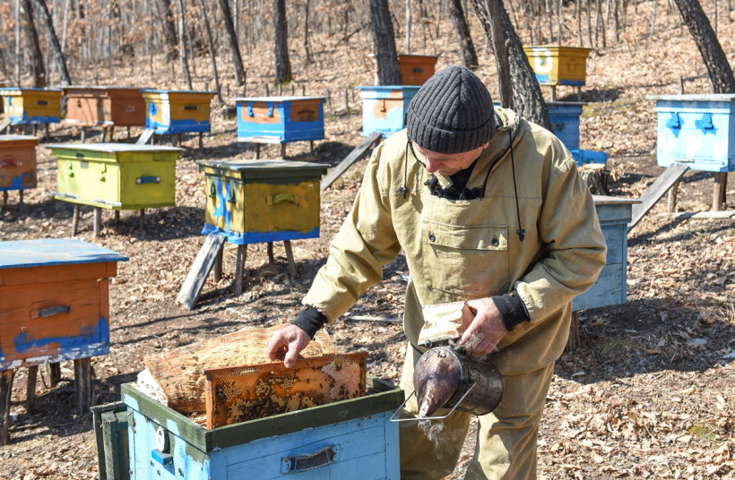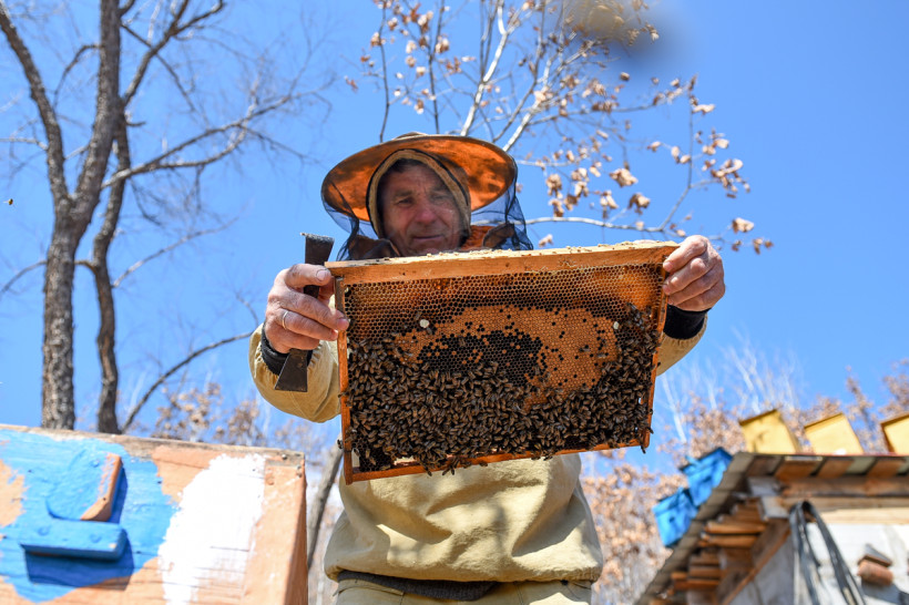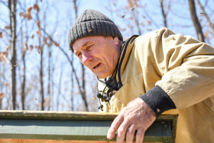 — Тихо, тихо, девочки прекрасные мои, — ласково обращается к пчёлам хозяин пасеки.