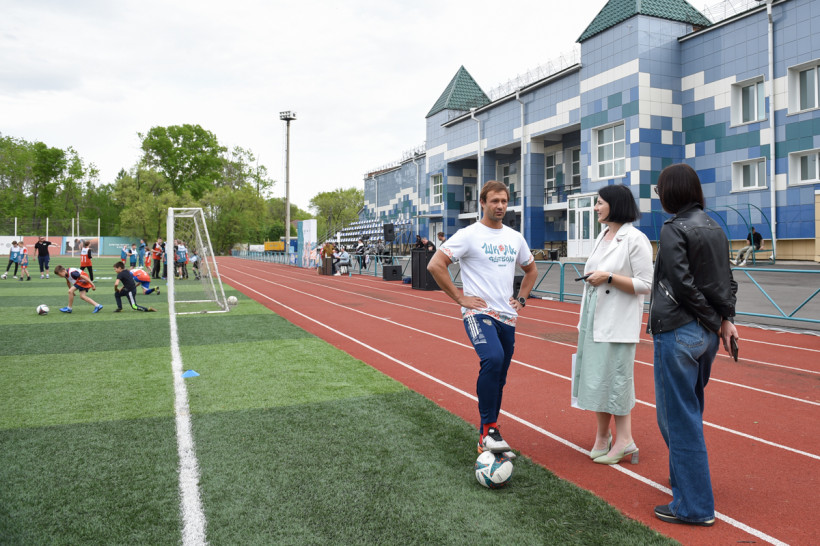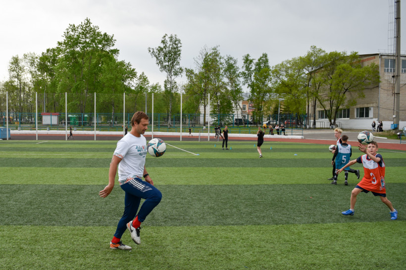 — Мяч не пинают, по нему бьют, — поправляет с улыбкой известный футболист, легко закручивая ногами мяч. К слову, спортивный инвентарь специально привезли с собой тренеры. Мячи изготовлены из переработанного пластика и останутся подарком городу Свободному.
