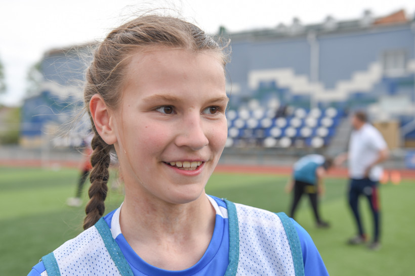 Екатерине из Архары 11 лет, и она играет в местной команде наравне с мальчиками. Слегка смущенно признается, что умеет делать футбольные финты и может обыграть ровесников.