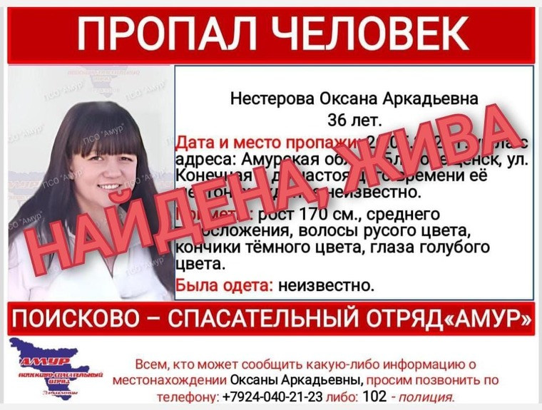 В Благовещенске найдена 36-летняя Оксана Нестерова, которая 26 мая ушла из дома в районе КПП. Как писала «Амурская правда», в пятницу женщина собиралась встретиться в кафе с подругами, но до заведения не дошла, а телефон был недоступен.