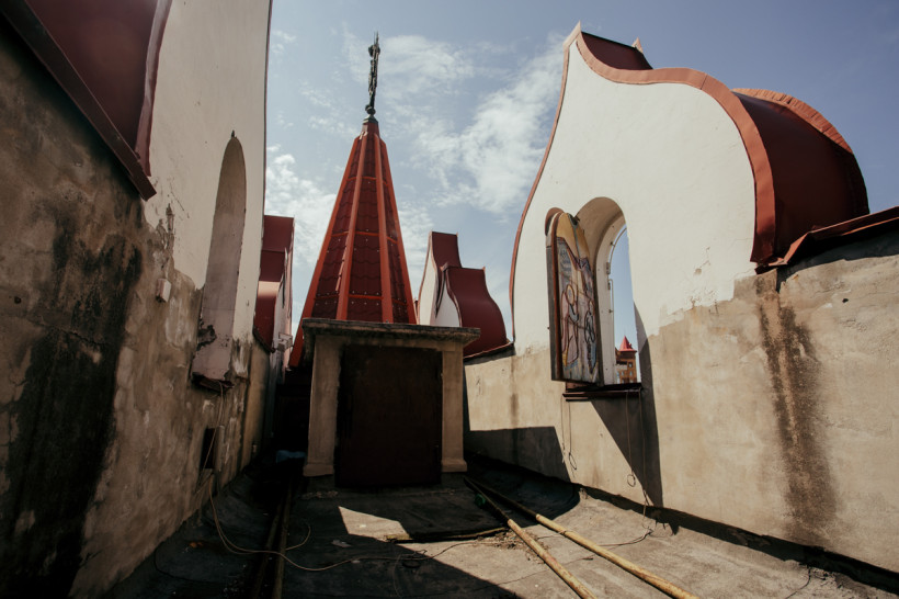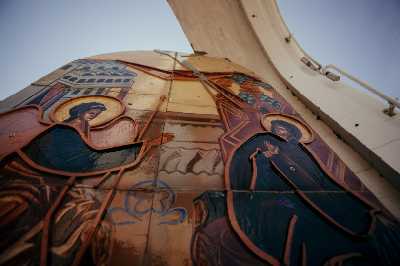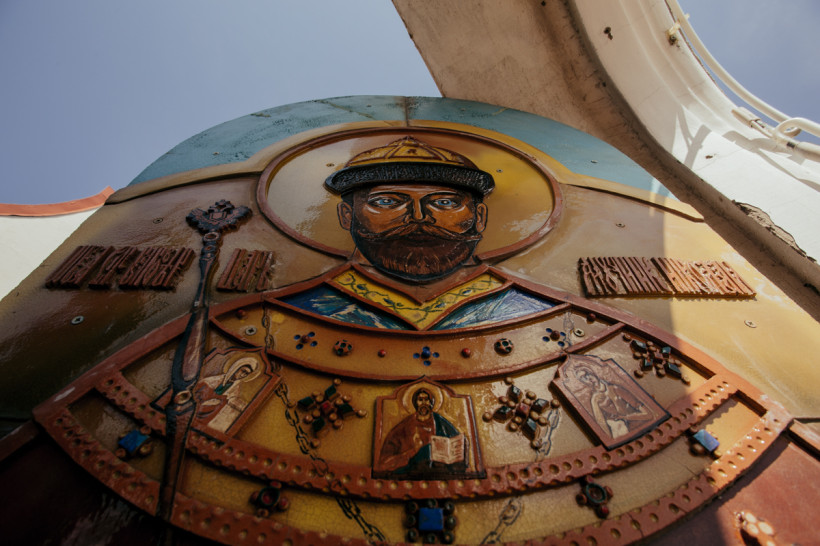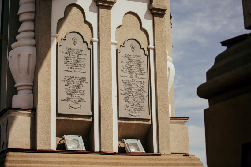 Из проема обращенного к набережной кокошника на Амур и разросшийся Хэйхэ с иконы глядит яркими голубыми глазами керамический Николай Второй, последний император Российской империи. В честь его приезда в Приамурье, тогда еще в качестве цесаревича — будущего наследника престола, в 1891 году в Благовещенске меньше чем за полгода построили первую Триумфальную арку. Приоткрыв ставню окошка — деревянный щит с иконой, удалось полюбоваться с 20‑метровой высоты летними видами современной благовещенской набережной, реки и соседнего берега. С первых царских ворот на Амур, кстати, глядел не царь, а святой Николай Чудотворец. Из проема противоположного кокошника, где закреплена керамическая икона Благовещения, взору предстала залитая солнцем площадь Победы с гуляющими по ней детьми и мамочками с колясками.