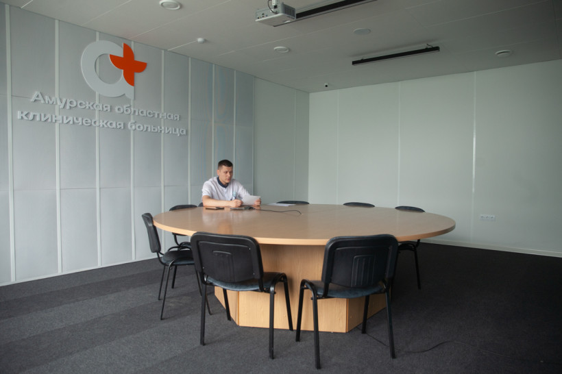 Телемедицинские технологии в АОКБ используют с 2019 года. Если раньше видео-конференц-связь с другими медорганизациями проводилась в обычном кабинете, то теперь появился полноценный зал — с большим экраном, современным оборудованием, круглым столом и шумоизоляцией.