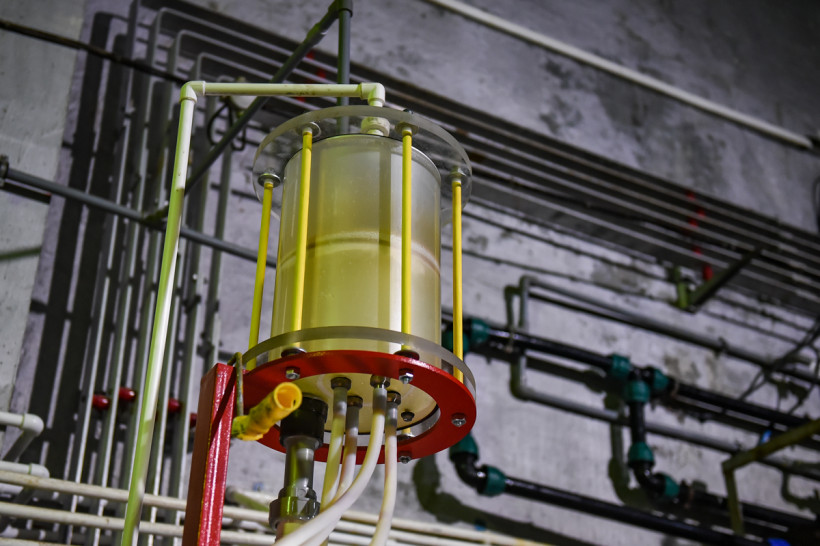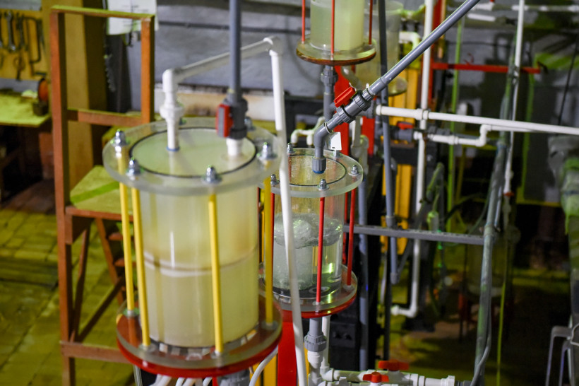 — Вот в этих резервуарах мы делаем рассол, который подаем на мембранные биполярные электролизеры. Сокращенно они называются МБЭ-300, потому что таких установок на водозаборе «Северный» три. Под воздействием постоянного электрического тока идет разложение раствора на газообразный хлор, — рассказали специалисты.
