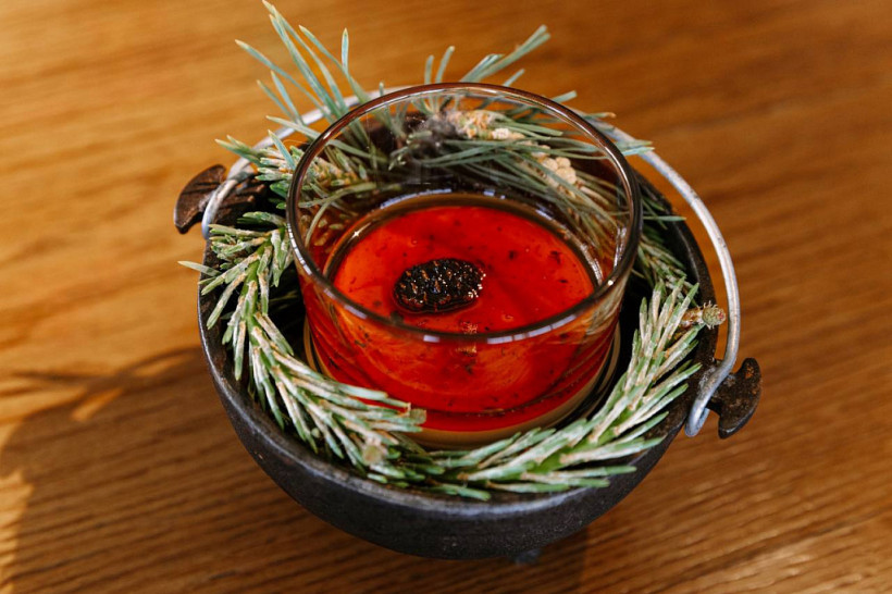 - говядину по-строгановски с картофельным пончиком, муссом из грибов и пудрой из капусты;