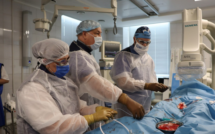 — У нашего пациента этот порок очень выраженный. Я таких пациентов достаточно много оперировал в разных регионах, и по моему опыту, маленький проход там все равно есть. И мы должны будем пройти через этот проход, расширить его баллоном и установить туда специальный стент. Тогда размер аорты станет таким, каким и должен быть, — рассказал Александр Осиев о манипуляциях, которые предстояло проделать хирургам.