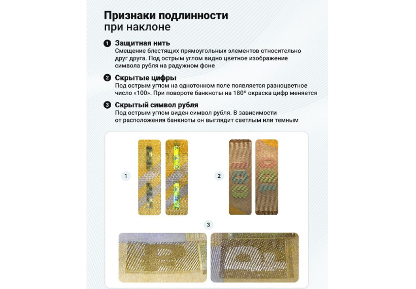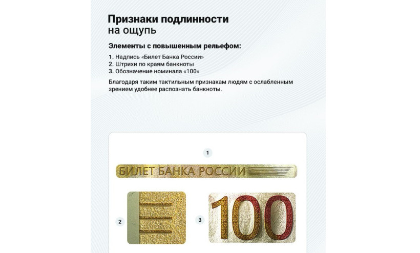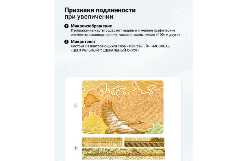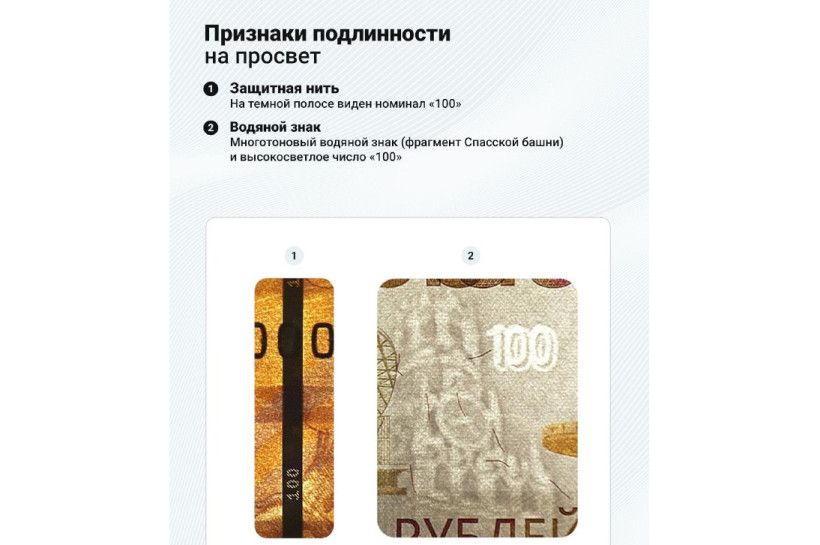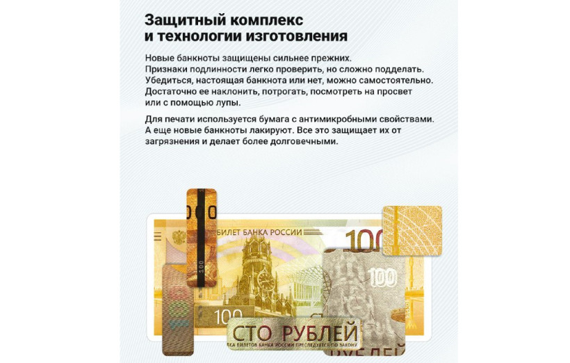 Обладатели новых купюр смогут подметить интересные детали. Например, часы на Спасской башне показывают время 20:22, то есть год выпуска банкнот — 2022-й. Новые банкноты в 100 рублей покрыты лаком для удлинения срока их службы на треть.