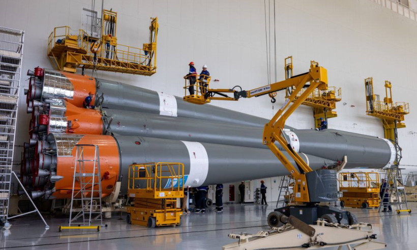 Первая и вторая ступени собраны в «пакет», проводятся работы со спутником и головным обтекателем. В ближайшее время будет собрана космическая головная часть.