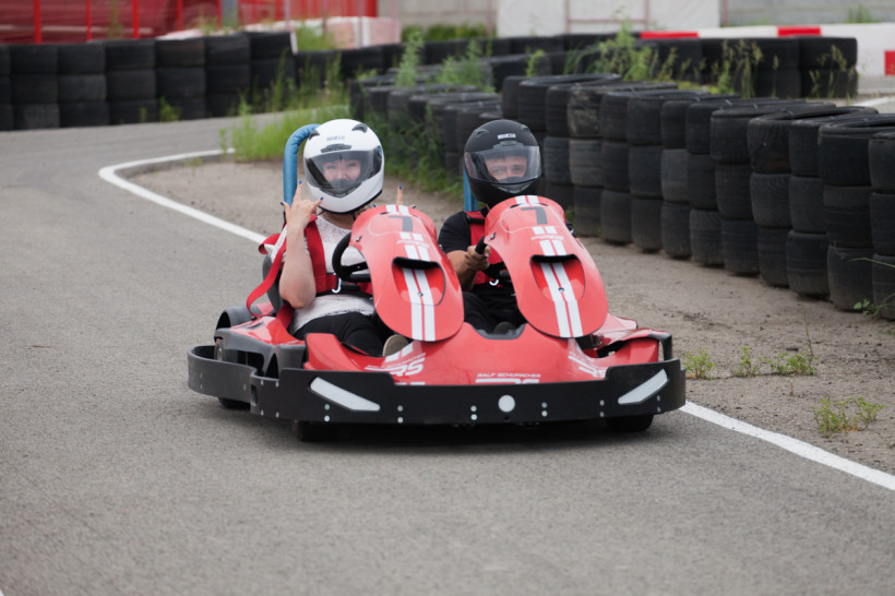 Журналисты «Амурской правды» тоже попробовали картинг — фотограф Владимир Воропаев прокатился на прокатном, на нем по требованиям безопасности установлено ограничение скорости, а вот журналиста Марию Мурашко прокатил чемпион — с ветерком.