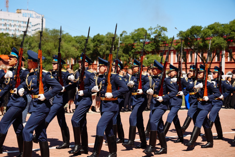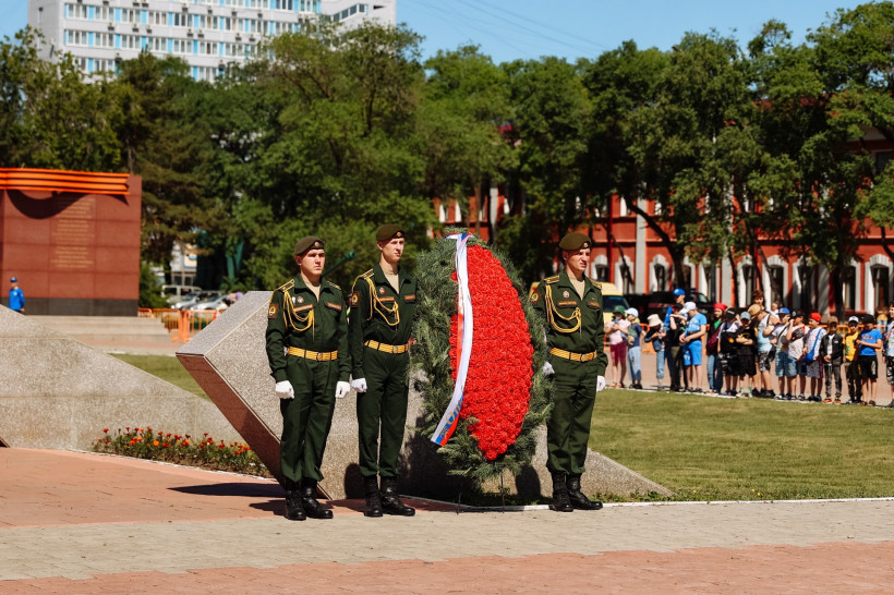 Кроме официальных лиц и ветеранов в церемонии приняли участие юнармейцы и курсанты Дальневосточного высшего общевойскового командного училища. Память о погибших в годы Великой Отечественной войны почтили минутой молчания. Затем был произведен ружейный салют.