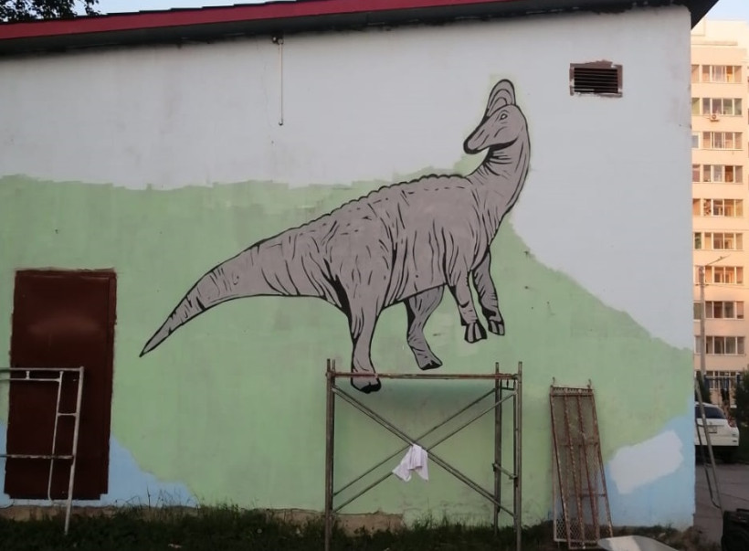 — На одной стене расположены фигуры динозавров, раскрасили фасадной водоэмульсионной краской с добавлением колеров, затем прорисовали с помощью маркеров. Работали на лесах и с перерывами — часто мешала погода: то сильный ветер не давал работать на высоте, то шли дожди, — рассказал участник проекта Максим Кузнецов-Мельников. — Центральный персонаж — амурозавр, он занимает другую стену. Сначала мы вывели его с помощью проектора на стену, обвели контур, а затем раскрасили. Его я раскрашивал с помощью профессиональной краски из баллончиков. Нам даже дети помогали.