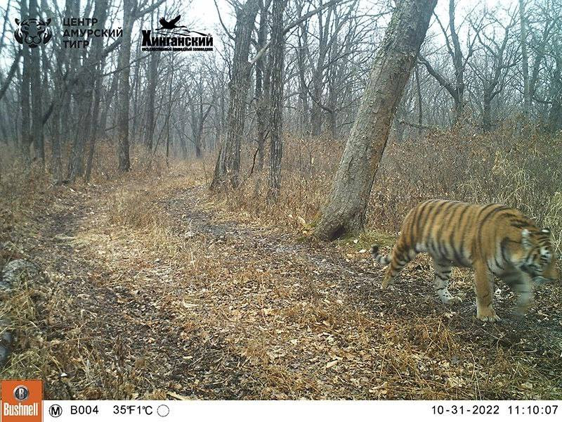 31 октября хищник сфотографировался в том же месте, на этот раз полоски были видны довольно отчетливо. Их расположение — своеобразный паспорт, и ученые установили, что это не тигрица Елена и не ее жених Шустрый.