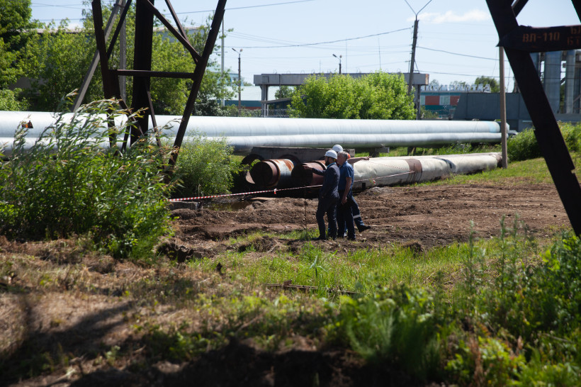 На площадке — огромные трубы, еще недавно по ним бежала горячая вода со станции. Подлежащие замене участки распилены на 12-метровые отрезки: вместо 800-миллиметровых труб здесь протянут 1000-миллиметровые. Новые, кстати российского производства, уже доставили.