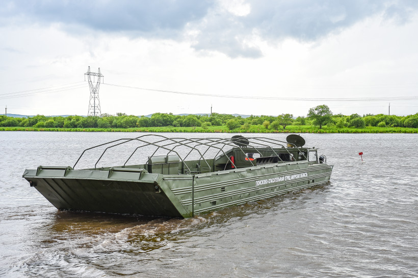 Плавающий транспортер ПТС-М предназначен для переправы людей и грузов через широкие водные преграды по пересеченной и заболоченной местности, а также в условиях отсутствия дорог. Высокие борта и небольшое удельное давление на грунт позволяют перевозить большие и негабаритные грузы, емкости с топливом и даже автомобили типа «Урал» и КамАЗ. В пассажирском отсеке при движении может разместиться более 40 человек, передает пресс-служба министерства лесного хозяйства и пожарной безопасности Амурской области.
