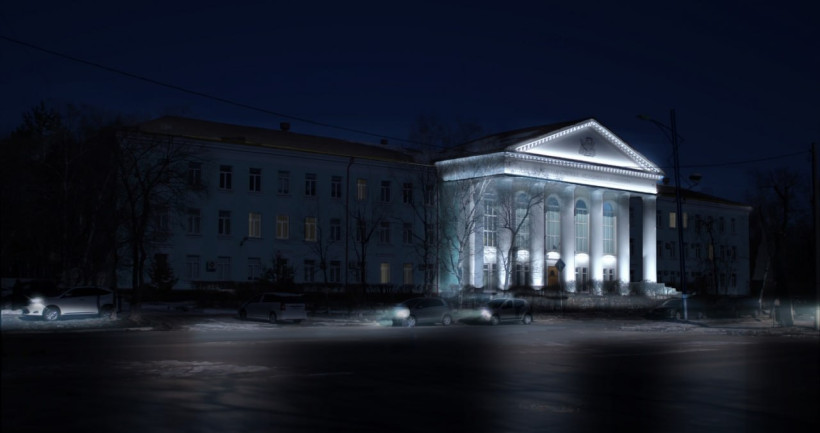 Три цвета будут использоваться в покраске главного корпуса Амурской медакадемии на Горького, 95. Центр развития территорий представил проект – не только этого здания, но и соседнего – общежития учреждения, в том числе – с подсветкой.