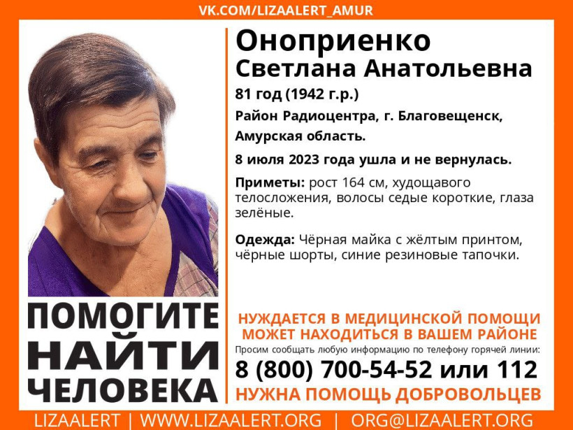 Сейчас пропавшую 8 июля ищут поисковики, родные и полицейские. Амурский поисково-спасательный отряд ГРОМ просит помощи у горожан, так как женщине срочно нужна медицинская помощь.