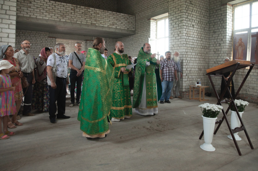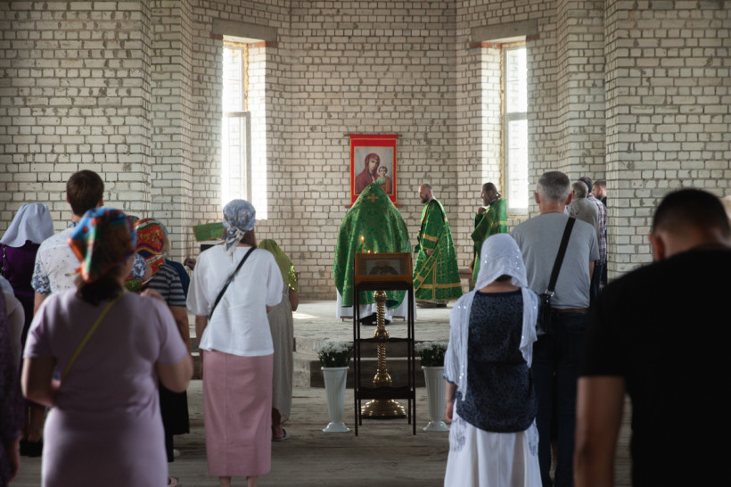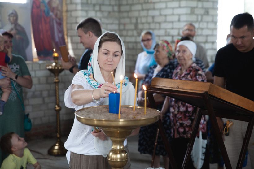 Несмотря на то что ремонтные работы в храме продолжаются и день выдался будничный, на службу приехали и пришли целыми семьями.