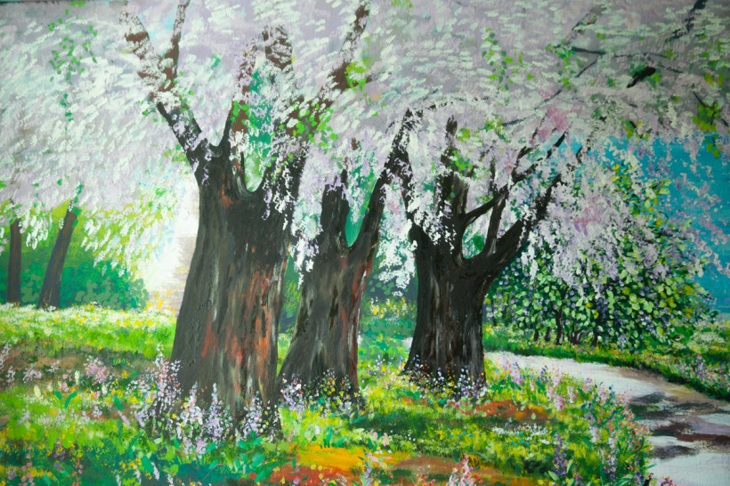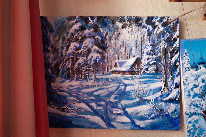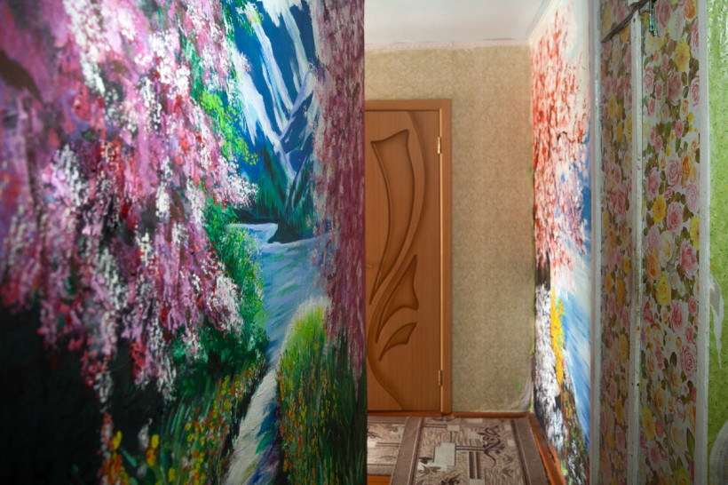 Однако куда больше удивления вызывает квартира самой Елены Владимировны. Попадая в прихожую, сразу оказываешься среди цветущих деревьев, разнотравья, синевы гор и рек. А в самой большой комнате одну из стен целиком занимает пейзаж парка с уходящей вдаль тропинкой. И везде — буйство красок, окунаясь в которое, будто попадаешь в дикий уголок природы.