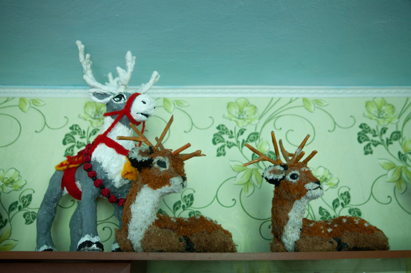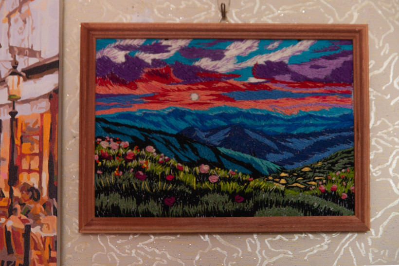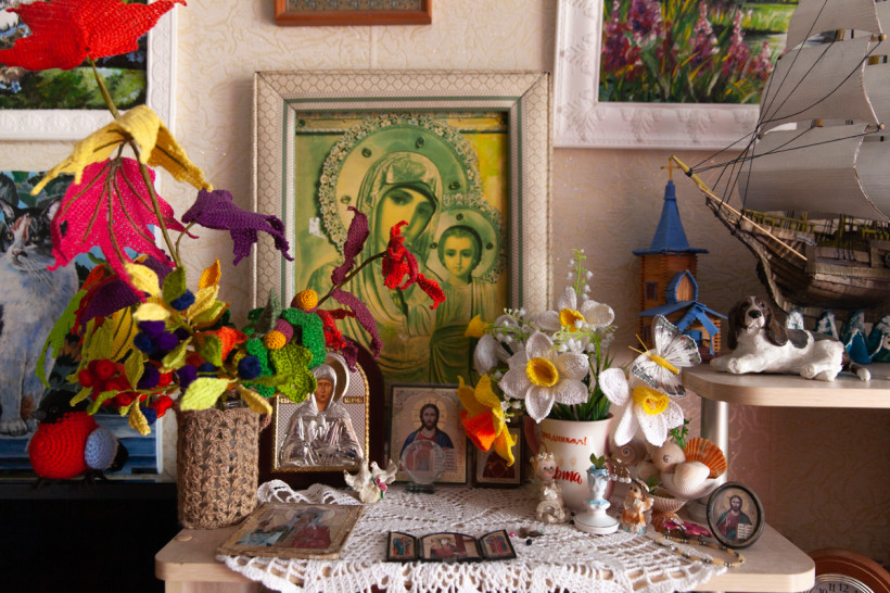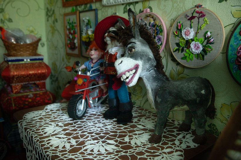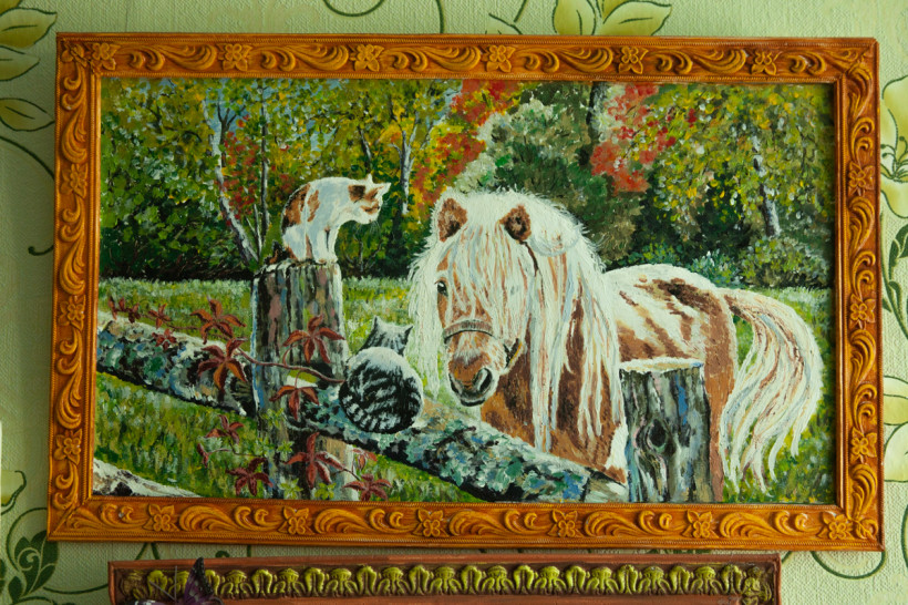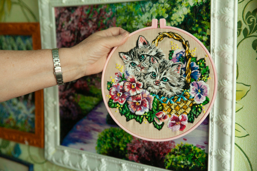 Картины в квартире Елены Владимировны не только вместо фотобоев, они — повсюду: маленькие и крупные, пейзажи и анималистика. Есть даже вышитые картины, очень насыщенные и реалистичные, а еще куклы, макеты судов и церкви, вязаные цветы и букеты, самодельные игрушки, ажурные салфетки — какой-то мини-музей рукоделия одного человека.