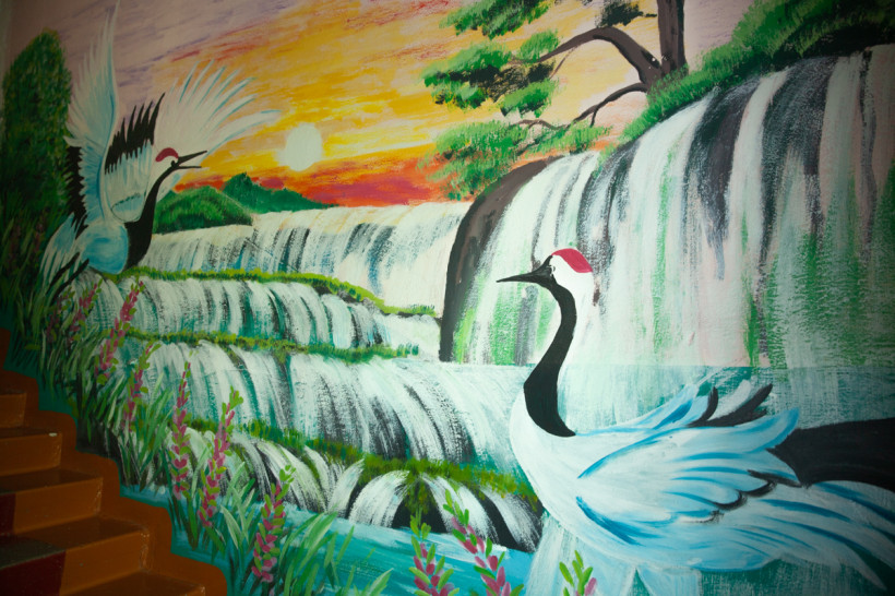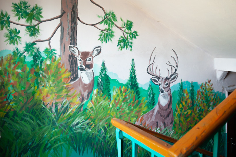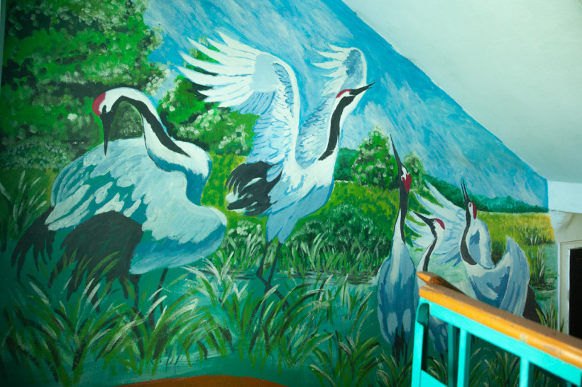 Журавли, олени и море в подъезде: зачем жительница амурского села расписала дома