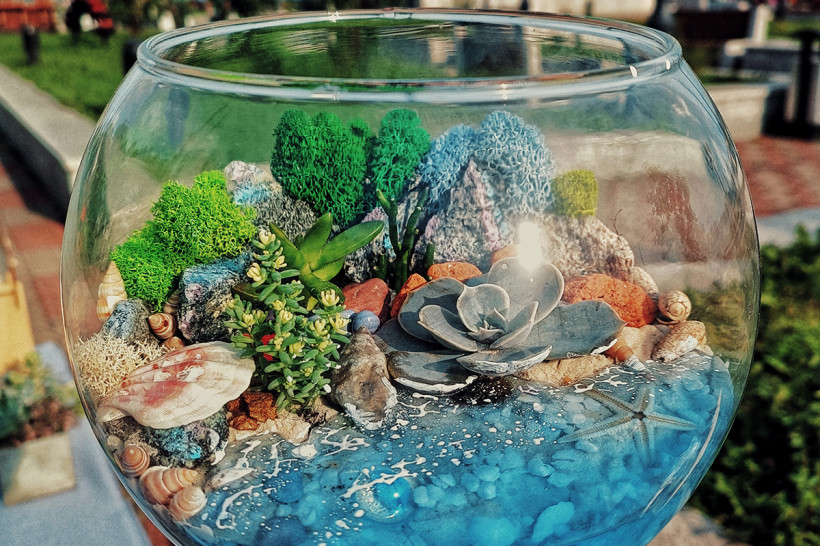 — Первый мой флорариум был обычной круглой вазой на ножке. Я ее выписала по интернету, заполнила песком, камнями, ракушками, высадила кактусы, — говорит цветовод. — А потом научилась сама делать кашпо из гипсоцемента. В молд — силиконовую форму — заливается гипсоцемент, в который добавляются различные красители. Обычно я делаю это на своей кухне.