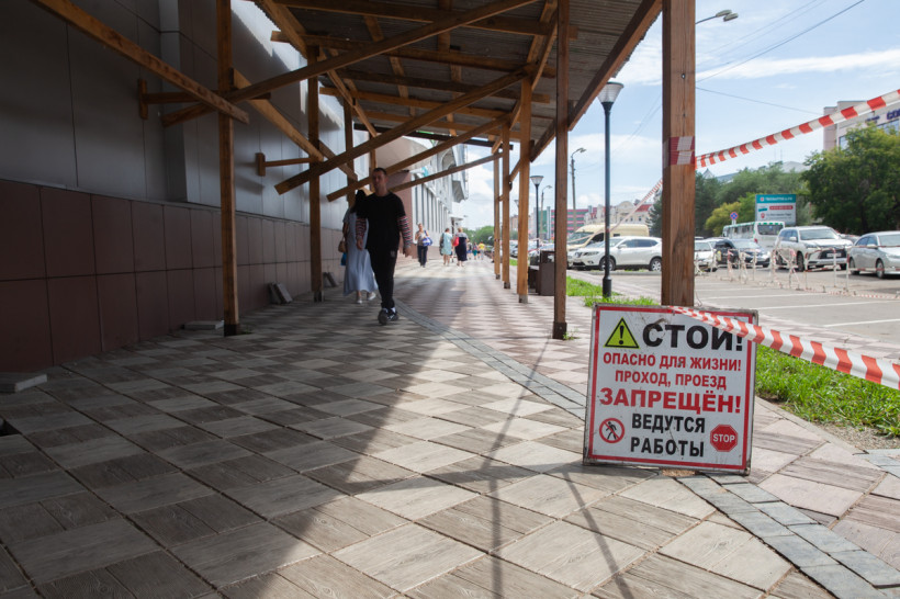 Александр отметил, что на сегодня в тех местах, где идут работы по улучшению фасада здания, выставлены навесы и ограждающие конструкции.