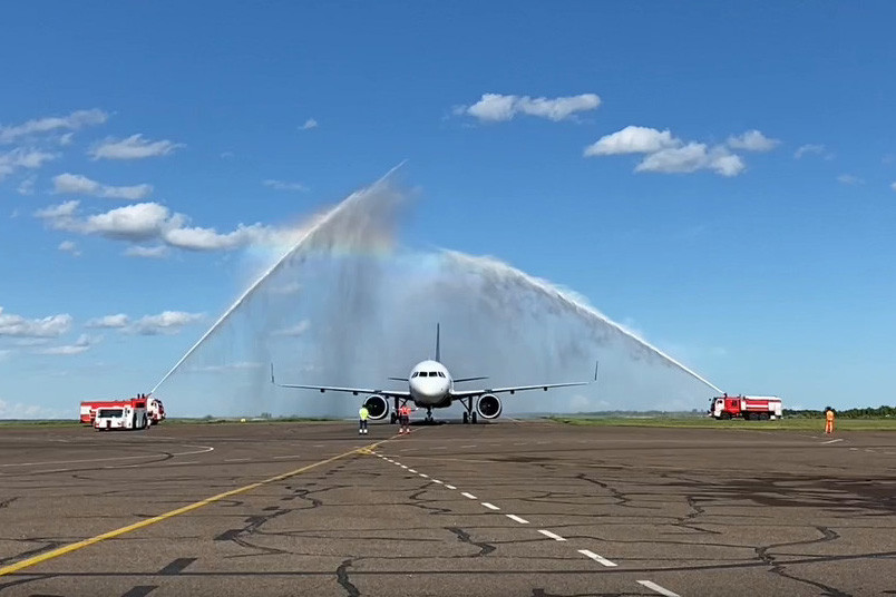 Радуга во время традиционного обливания — хороший знакАэропорт «Игнатьево» амурской столицы накануне встретил первый после пандемии международный рейс Ташкент — Благовещенск — Ташкент. Самолет после приземления проехал под водяной аркой, которую создали пожарные машины, подавая воду из брандспойтов.