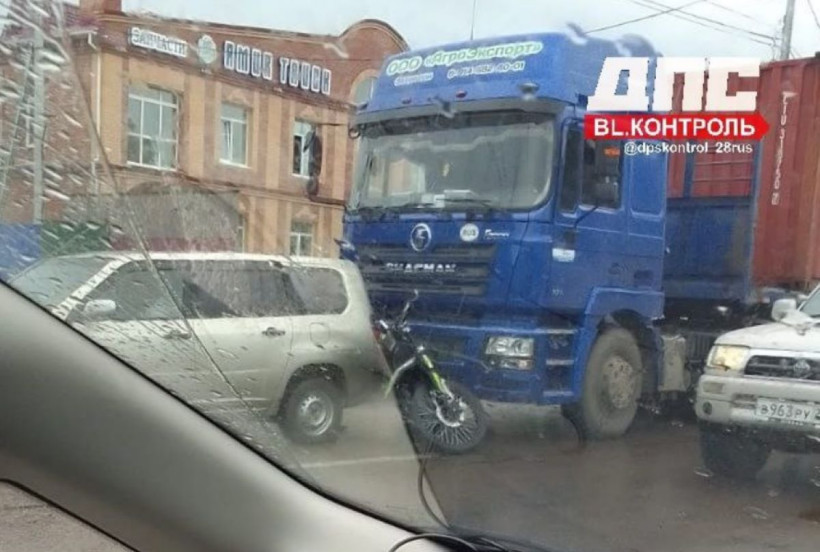 По данным telegram-канала @dpskontrol_28rus, около полудня мотоцикл попал между грузовиком SHACMAN и универсалом Toyota Probox. Водителя двухколесного транспортного средства увезли в больницу.