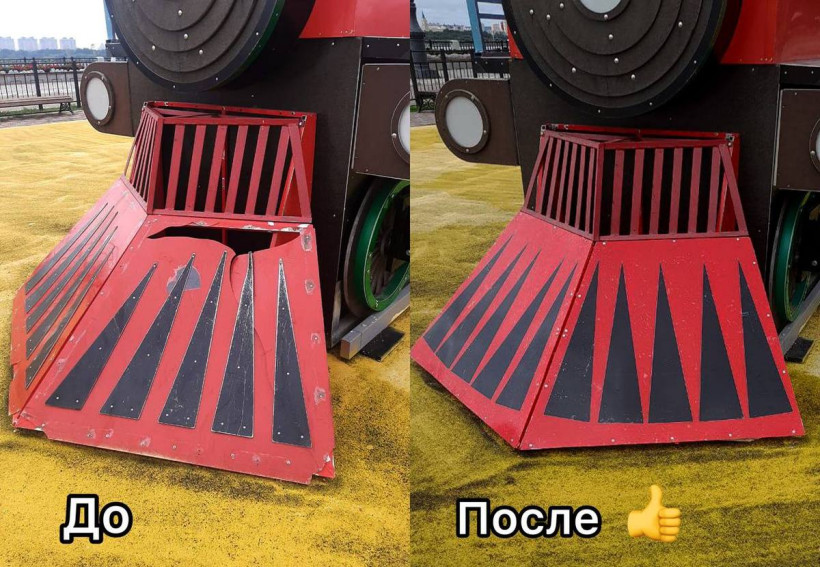 Сломанную деталь своими силами восстановили сотрудники ГСТКНа самой большой детской площадке Благовещенска отремонтировали паровозик, который подвергся нападкам вандалов. Декоративный путеочиститель в ночь на 12 августа проломили ногами ночные хулиганы. Их зафиксировали камеры видеонаблюдения.