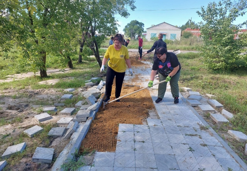 Во время дождя в селе Амурское размыло пешеходную дорожку в сквере. Сельчане не стали ждать помощи и отремонтировали ее своими силами. Всего за два часа.