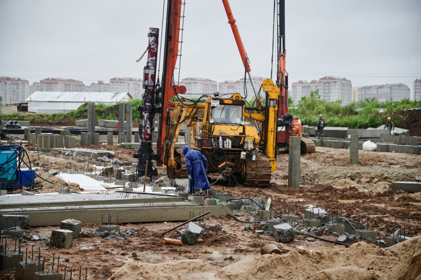 Техника продолжает откачивать воду из котлована и сейчас. «Котлован у нас полностью готов, начали забивать сваи. Всего нужно забить почти тысячу свай — осталось около 300. Дождь, конечно, вносит коррективы, — объясняет Денис Грошев. — Сейчас высушим котлован и дальше забивать будем: технология отлажена. Конечно, это дополнительные расходы, а самое главное — потеря времени. Придется потом ускоряться, чтобы не выбиться из графика».