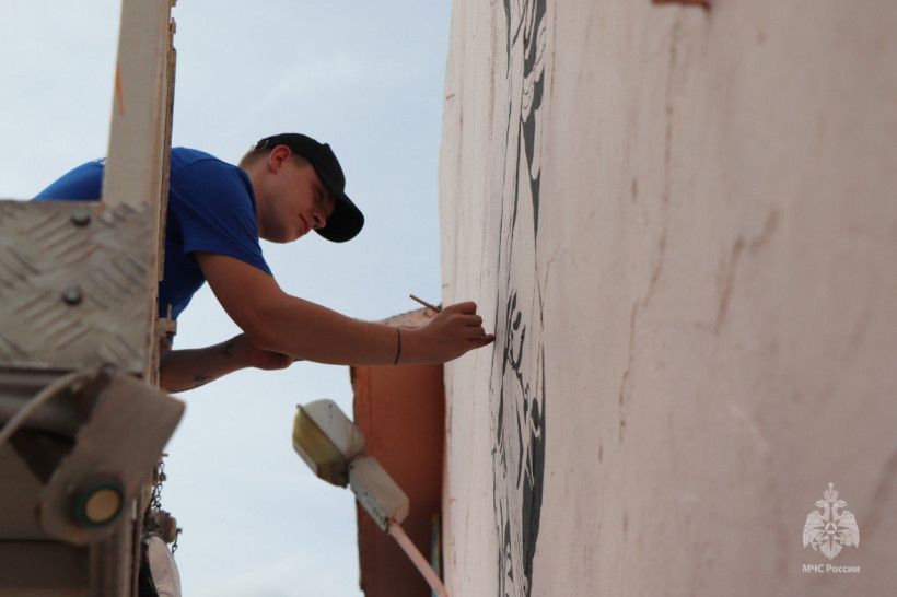 Благовещенский огнеборец украшает муралом стену пожарной части