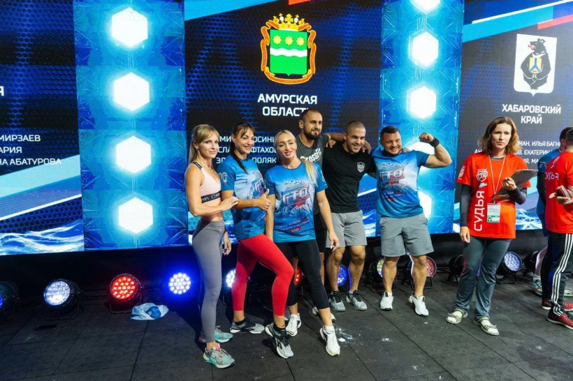 Вторым видом испытаний стала полоса препятствий, которая состояли из элементов комплекса ГТО. В ней участвовала вся сборная команда из Приамурья — Юлия Осинцева, Эльвира Полякова, Екатерина Кунцевич, Игорь Куперцев, Руслан Мифтахов и Михаил Осинцев. Каждому участнику нужно было выполнить 6 прыжков в длину: на 140 сантиметров женщинам и 160 см мужчинам, 24 отжимания, 12 рывков гири весом в 16 кило для спортсменов мужского пола, приседания с гирей 8 килограммов для прекрасных дам, а также 24 повторения на пресс и канат. По сумме двух испытаний за день команда региона набрала 182 балла и заняла промежуточное первое место.