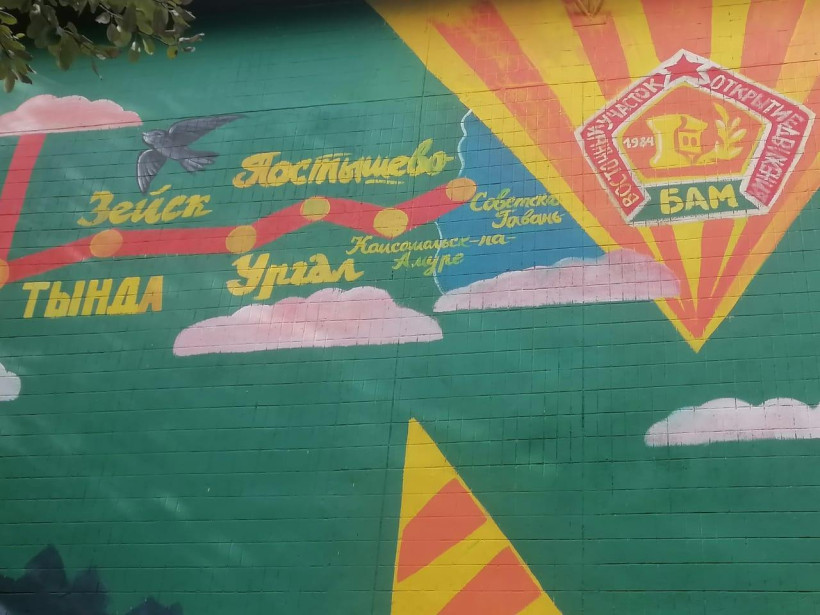 Спецтехника, тайга и процесс строительства Байкало-Амурской магистрали украсили здание музея истории БАМа в Тынде. На фасаде учреждения культуры 13 сентября завершены работы по нанесению тематических муралов. Часть идей рисунков позаимствована из фонда музея и выполнена в стиле советской эпохи периода стройки века.